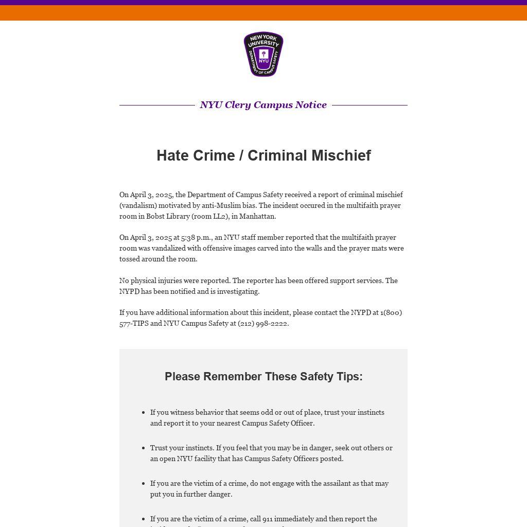 On April 3, 2025, the Department of Campus Safety received a report of criminal mischief (vandalism) motivated by anti-Muslim bias. The incident occured in the multifaith prayer room in Bobst Library (room LL2), in Manhattan.