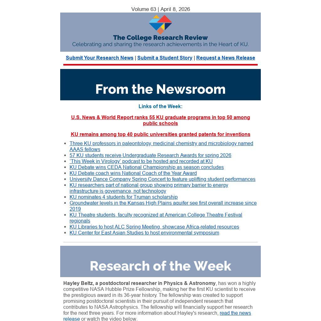 Hayley Beltz, a postdoctoral researcher in Physics & Astronomy, has won a highly competitive NASA Hubble Prize Fellowship, making her the first KU scientist to receive the prestigious award in its 36-year history. The fellowship was created to support promising postdoctoral scientists in their pursuit of independent research that contributes to NASA Astrophysics. The fellowship will financially support her research for the next three years. For more information about Hayley's research, read the news release or watch the video below.