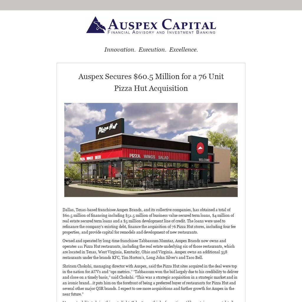 Shriram Chokshi, managing director with Auspex, said the Pizza Hut sites acquired in the deal were top in the nation for AUVs and “ops metrics.” “Tabbassum won the bid largely due to his credibility to deliver and close on a timely basis,” said Chokshi. “This was a strategic acquisition in a strategic market and in an iconic brand...it puts him on the forefront of being a preferred buyer of restaurants for Pizza Hut and several other major QSR brands. I expect to see more acquisitions and further growth for Ampex in the near future."