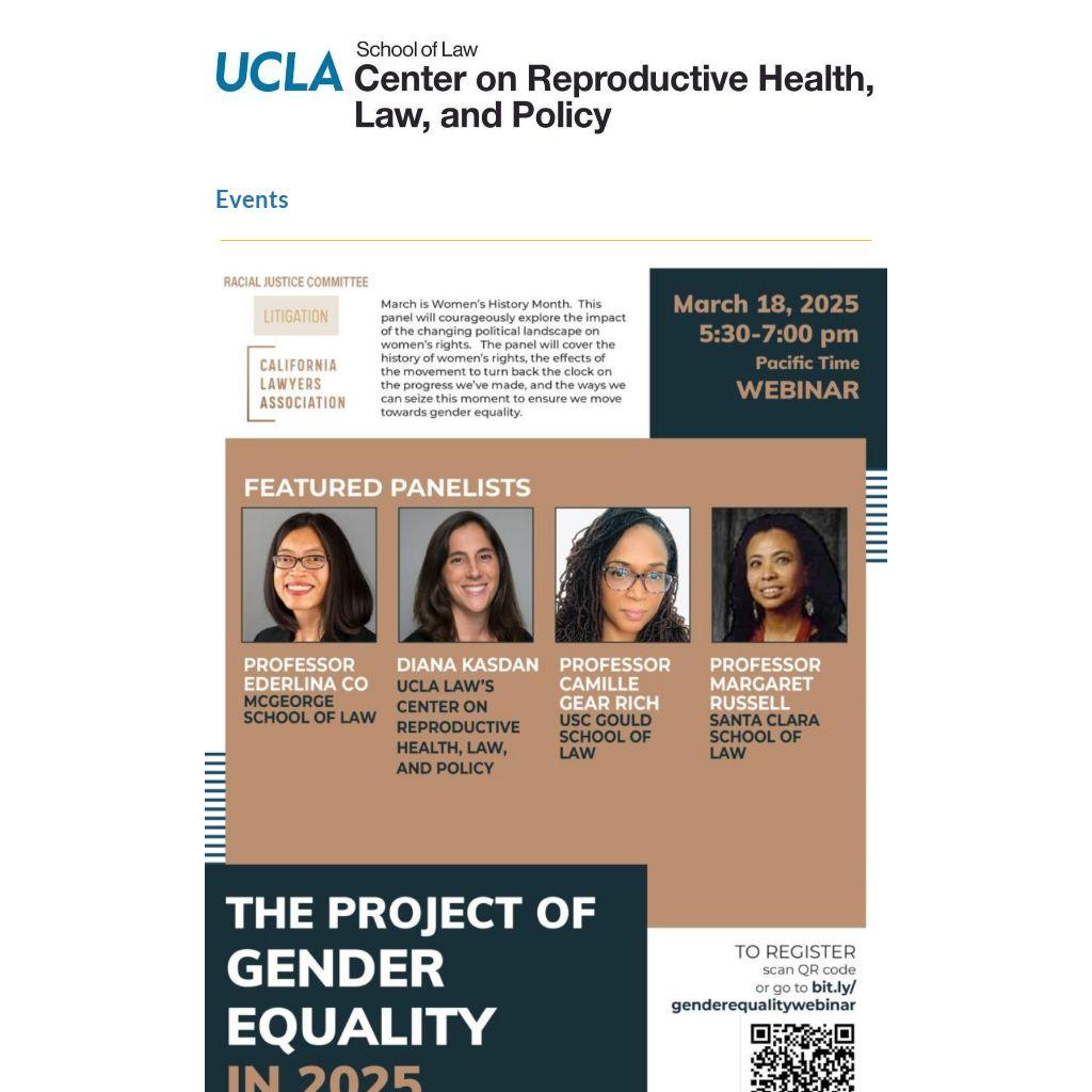 Sign up today for a March 18 webinar, “The Project of Gender Equality in 2025,” featuring CRHLP's Legal and Policy Director Diana Kasdan, Professor Ederlina Co, Professor Camille Rich, and Professor Margaret Russell. This panel will celebrate women’s rights and provide insights on how the changing political landscape directly impacts gender equality and reproductive rights.