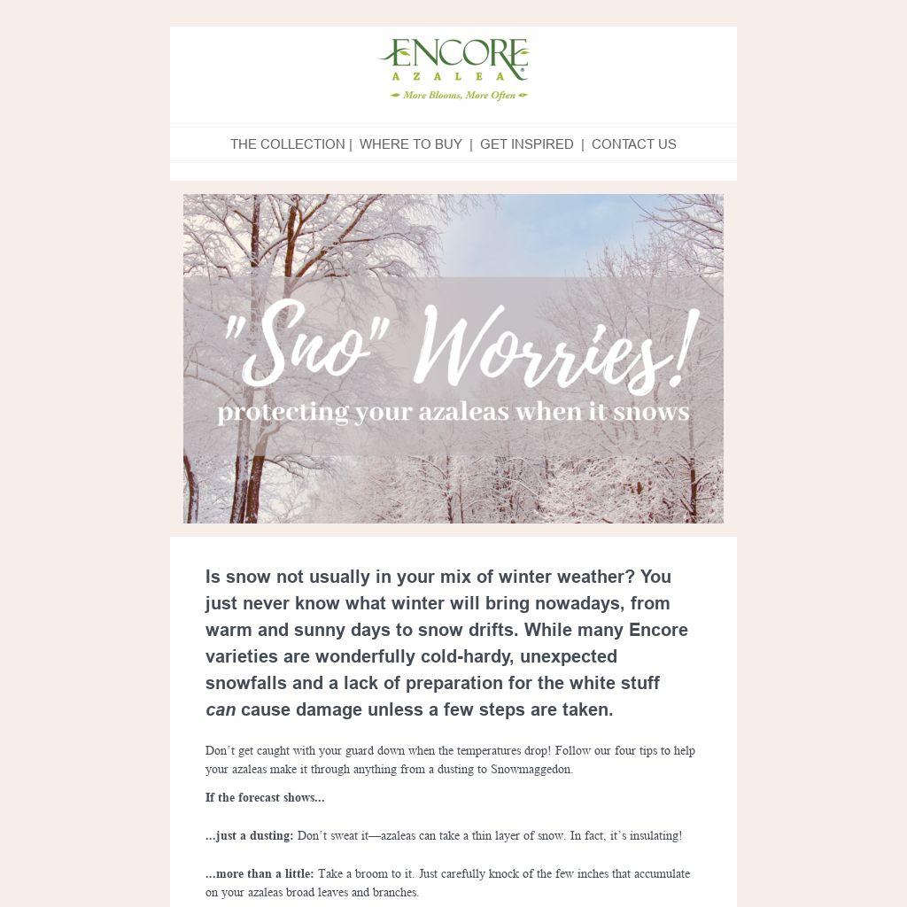 Is snow not usually in your mix of winter weather? You just never know what winter will bring nowadays, from warm and sunny days to snow drifts. While many Encore varieties are wonderfully cold-hardy, unexpected snowfalls and a lack of preparation for the white stuff can cause damage unless a few steps are taken.