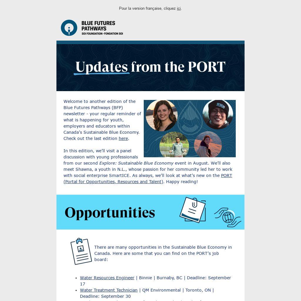In this edition, we’ll visit a panel discussion with young professionals from our second Explore: Sustainable Blue Economy event in August. We’ll also meet Shawna, a youth in N.L., whose passion for her community led her to work with social enterprise SmartICE. As always, we’ll look at what’s new on the PORT (Portal for Opportunities, Resources and Talent). Happy reading!