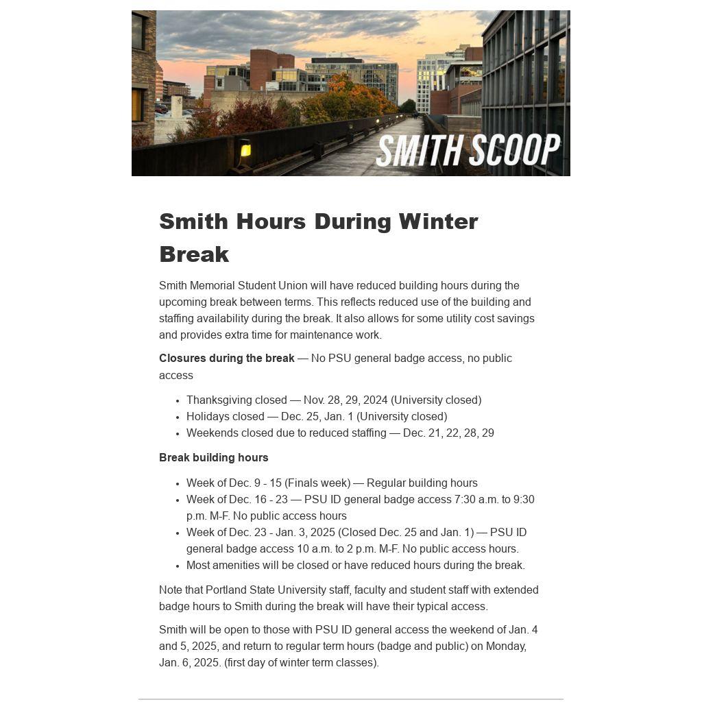 Note that Portland State University staff, faculty and student staff with extended badge hours to Smith during the break will have their typical access.