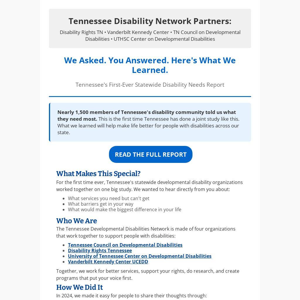 Nearly 1,500 members of Tennessee's disability community told us what they need most. This is the first time Tennessee has done a joint study like this. What we learned will help make life better for people with disabilities across our state.