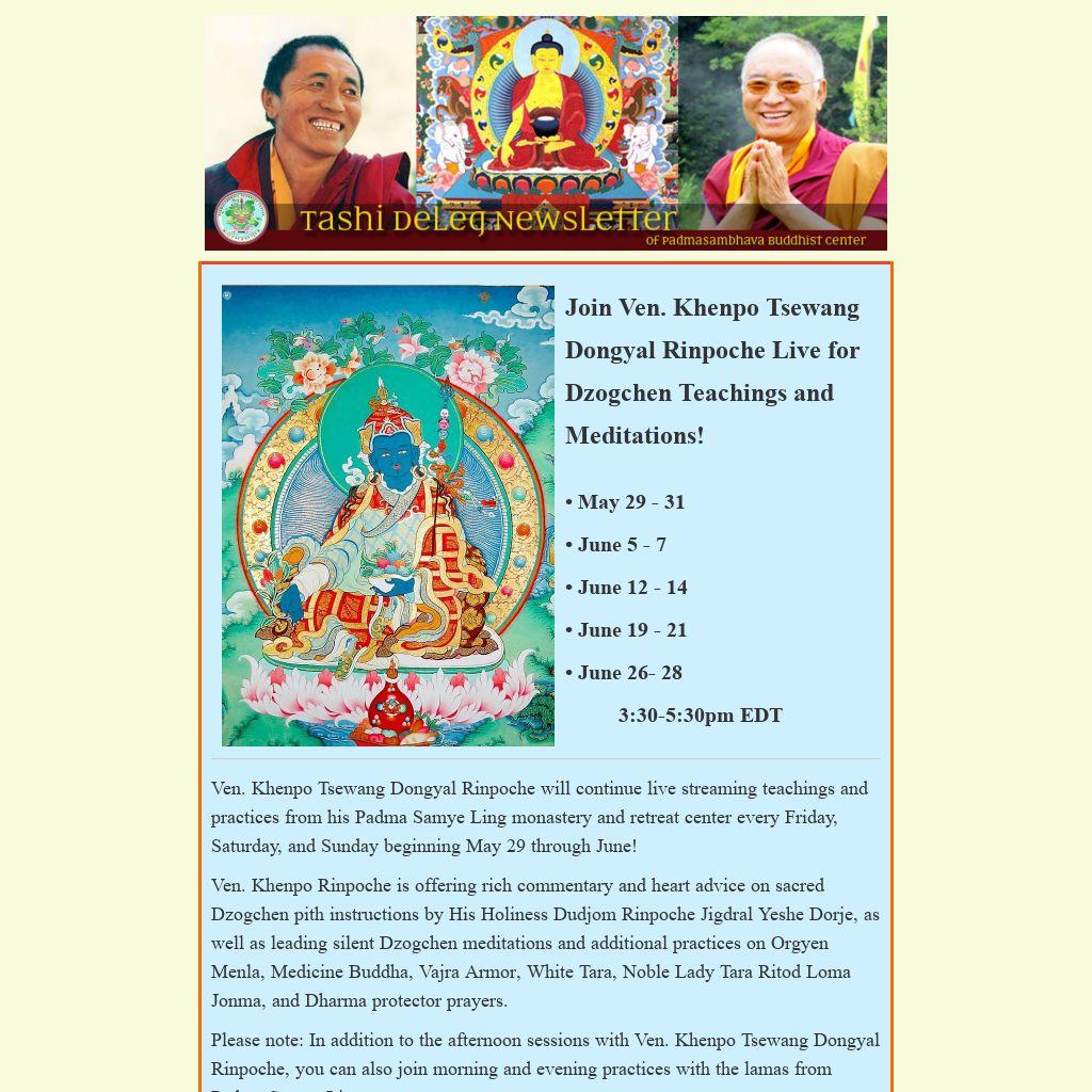 Ven. Khenpo Tsewang Dongyal Rinpoche will continue live streaming teachings and practices from his Padma Samye Ling monastery and retreat center every Friday, Saturday, and Sunday beginning May 29 through June!