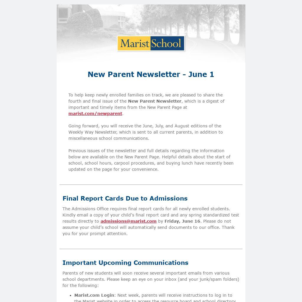 To help keep newly enrolled families on track, we are pleased to share the fourth and final issue of the New Parent Newsletter, which is a digest of important and timely items from the New Parent Page at marist.com/newparent.