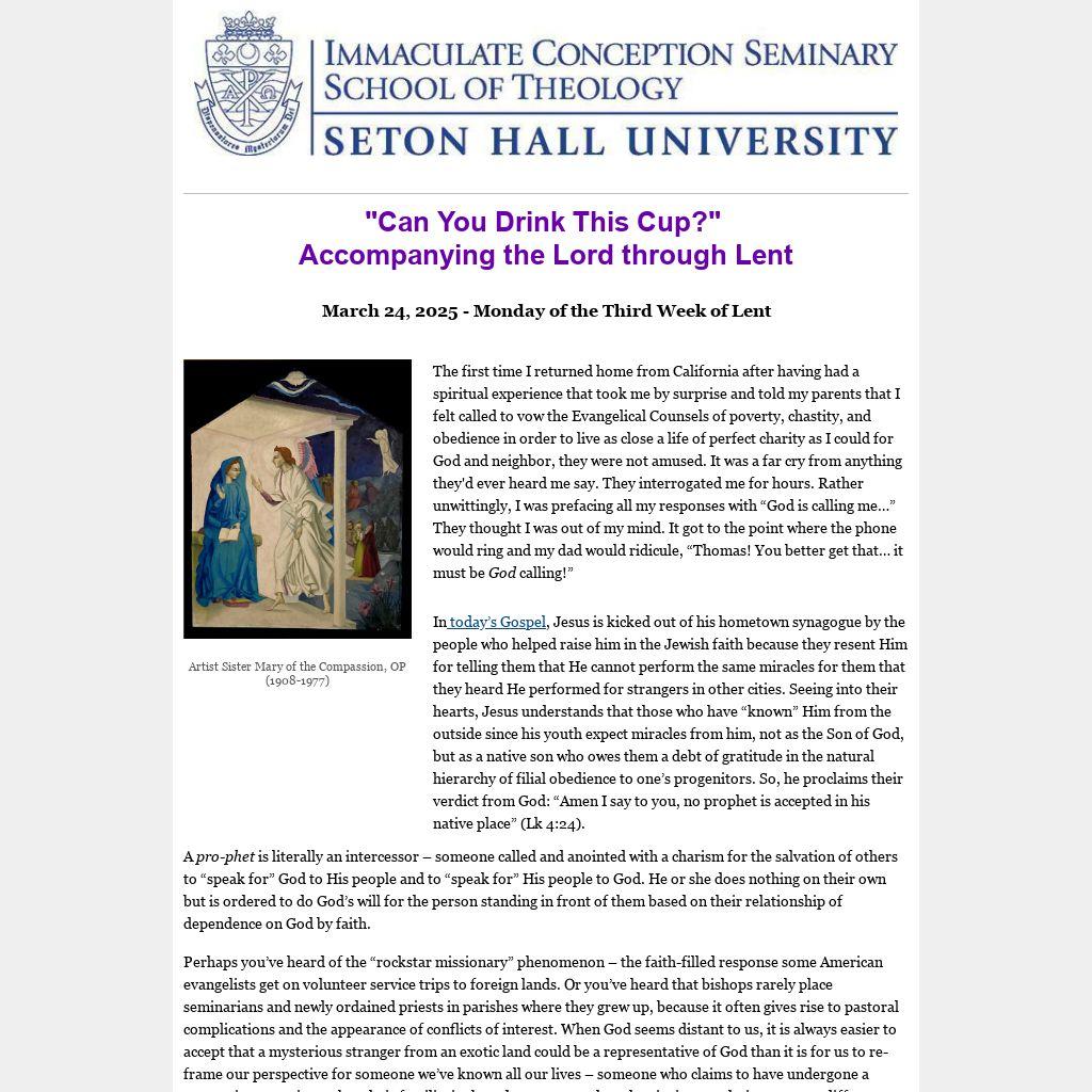 Can you drink this cup with Jesus? A person’s gifts and talents can be overlooked by those close to them. As you seek to deepen your relationship with God this Lent and become a more faithful representative of His love to those whom you love most, have you considered that you might not be the best messenger of the Gospel God could send into their lives? Arranging for loved ones to speak with “strangers” about their lapsed faith and spiritual problems will often let “fresh water” into the stagnant flow of your family relations and make greater headway with reawakening their faith to God’s faithfully unchanging love for them. Truth be told, this is one of the mysteriously counterintuitive ways God honors the importance of our personal faith response and connects families to the wider human family of God as He gathers His people together.