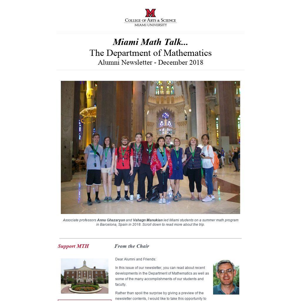 | Dear Alumni and Friends: In this issue of our newsletter, you can read about recent developments in the Department of Mathematics as well as some of the many accomplishments of our students and faculty. Rather than spoil the surprise by giving a preview of the newsletter contents, I would like to take this opportunity to ask you to do something for me. Of particular interest to both current students and faculty is what our former students are doing. So, if you have some time to spare, please drop us a short note telling us what life after Miami is like, how Miami prepared you for this life, and what are your plans for the future. We are extremely grateful for the financial contributions we receive from our alumni and friends, but our students also benefit greatly from hearing stories about our alumni and getting a glimpse at what life might have in store for them after graduation. I wish you well for the holiday season and for the new year. Keep in touch! P.S. For future newsletters, please be sure to share your stories with us. We will feature your updates in our newsletter's "Alumni Spotlight" section.