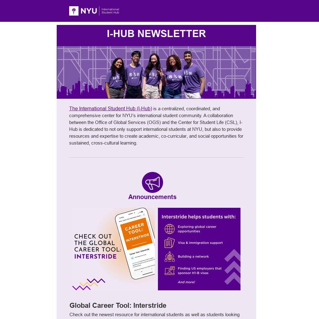 The International Student Hub (I-Hub) is a centralized, coordinated, and comprehensive center for NYU’s international student community. A collaboration between the Office of Global Services (OGS) and the Center for Student Life (CSL), I-Hub is dedicated to not only support international students at NYU, but also to provide resources and expertise to create academic, co-curricular, and social opportunities for sustained, cross-cultural learning.