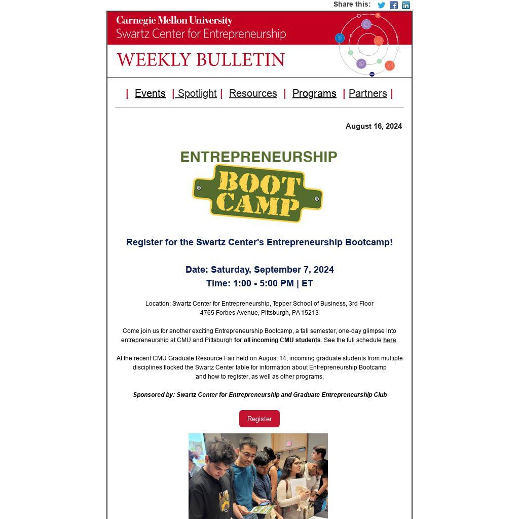 Come join us for another exciting Entrepreneurship Bootcamp, a fall semester, one-day glimpse into entrepreneurship at CMU and Pittsburgh for all incoming CMU students. See the full schedule here.