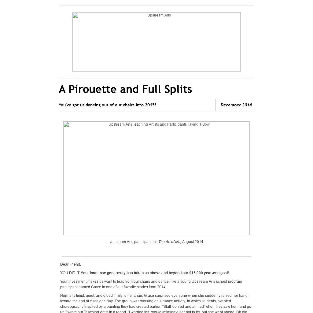 Your investment makes us want to leap from our chairs and dance, like a young Upstream Arts school program participant named Grace in one of our favorite stories from 2014: