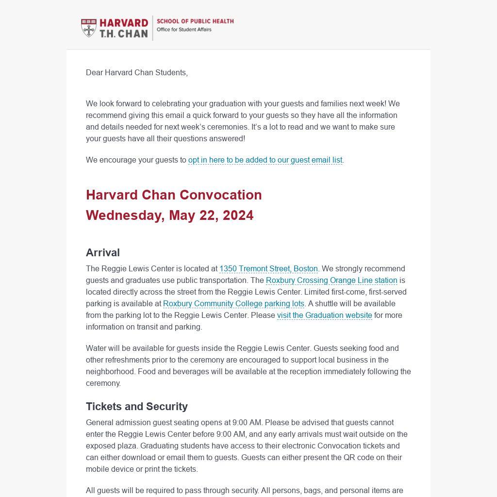 Overflow seating is available at Harvard Chan in Sebastian’s Café and Kresge ground floor classrooms. Convocation will be live-streamed on the Harvard Chan website. The live stream will begin at 10:15 AM.