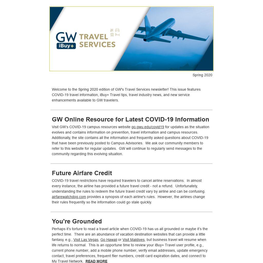 Welcome to the Spring 2020 edition of GW's Travel Services newsletter! This issue features COVID-19 travel information, iBuy+ Travel tips, travel industry news, and new service enhancements available to GW travelers.
