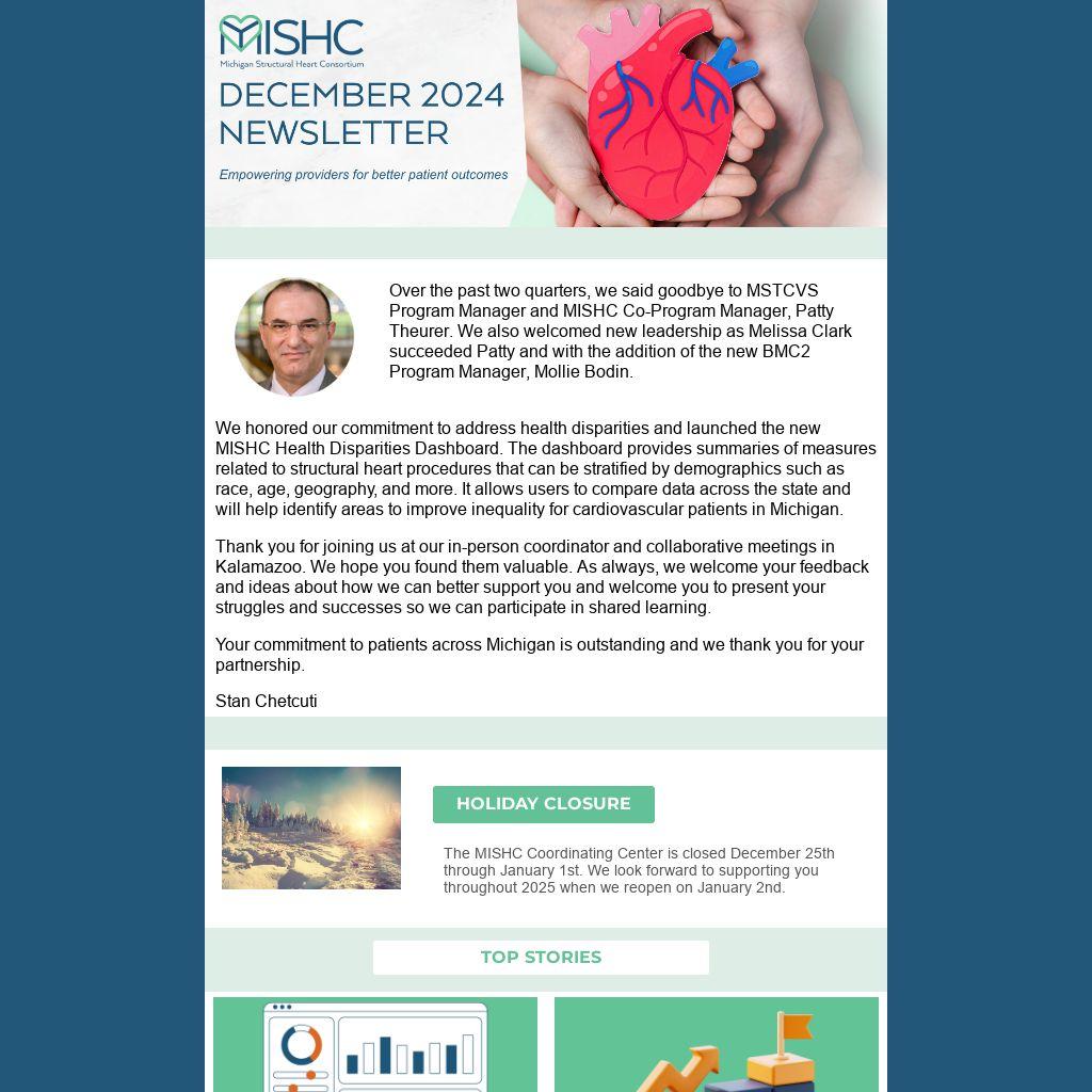 We honored our commitment to address health disparities and launched the new MISHC Health Disparities Dashboard. The dashboard provides summaries of measures related to structural heart procedures that can be stratified by demographics such as race, age, geography, and more. It allows users to compare data across the state and will help identify areas to improve inequality for cardiovascular patients in Michigan.