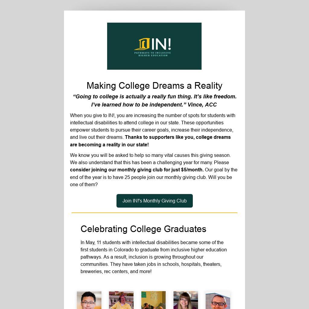When you give to IN!, you are increasing the number of spots for students with intellectual disabilities to attend college in our state. These opportunities empower students to pursue their career goals, increase their independence, and live out their dreams. Thanks to supporters like you, college dreams are becoming a reality in our state!