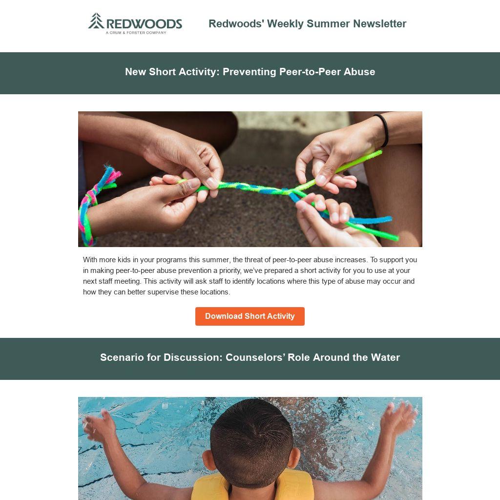 Counselors are a critical layer of protection when around pools and waterfronts. It’s important that they are clear about their role and responsibilities, and understand how they can support the lifeguards on duty. At your next staff meeting, we encourage you to use our scenario that focuses on the role of counselors in keeping swimmers safe. After, share our one-pager to help reinforce the counselor's role.