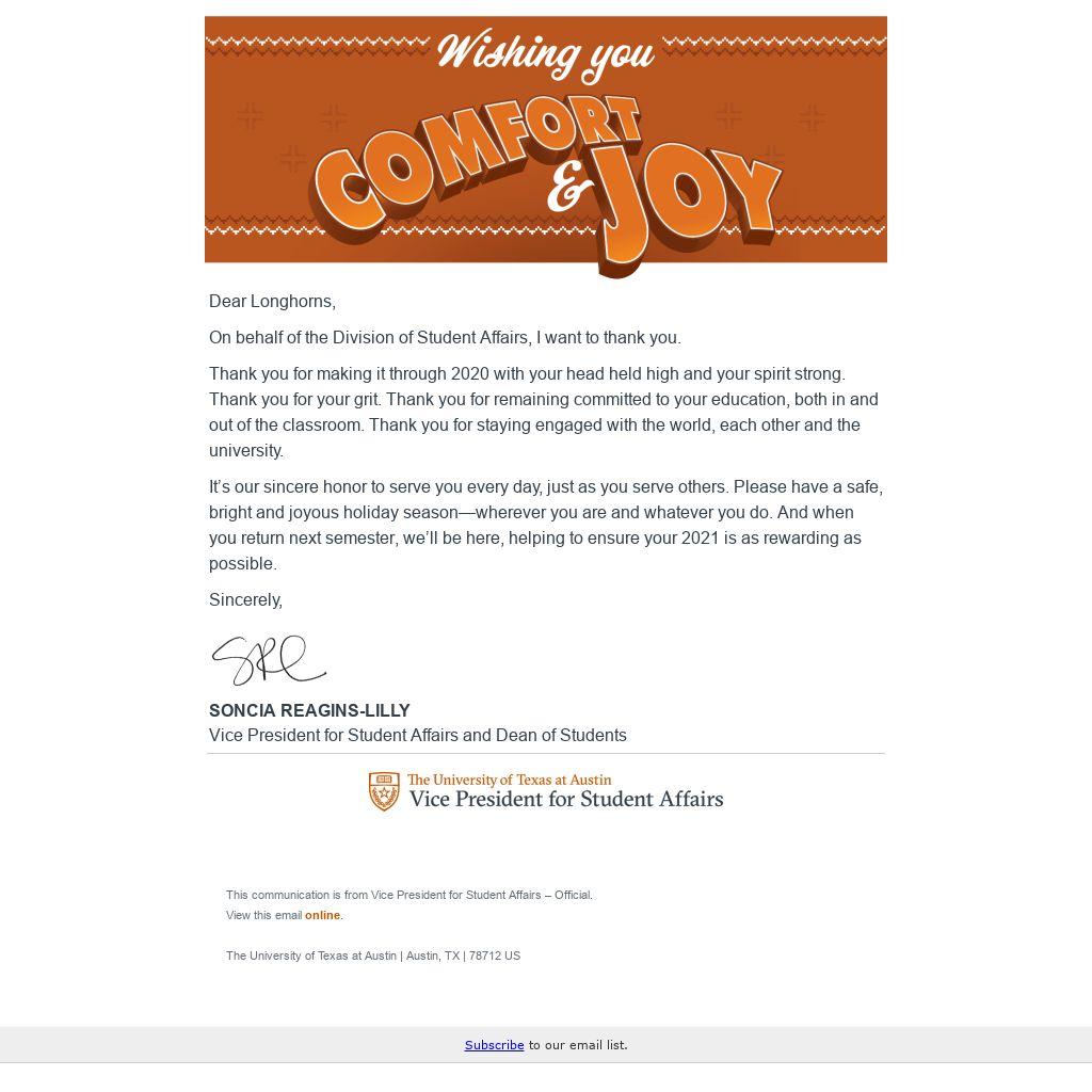 It’s our sincere honor to serve you every day, just as you serve others. Please have a safe, bright and joyous holiday season—wherever you are and whatever you do. And when you return next semester, we’ll be here, helping to ensure your 2021 is as rewarding as possible.