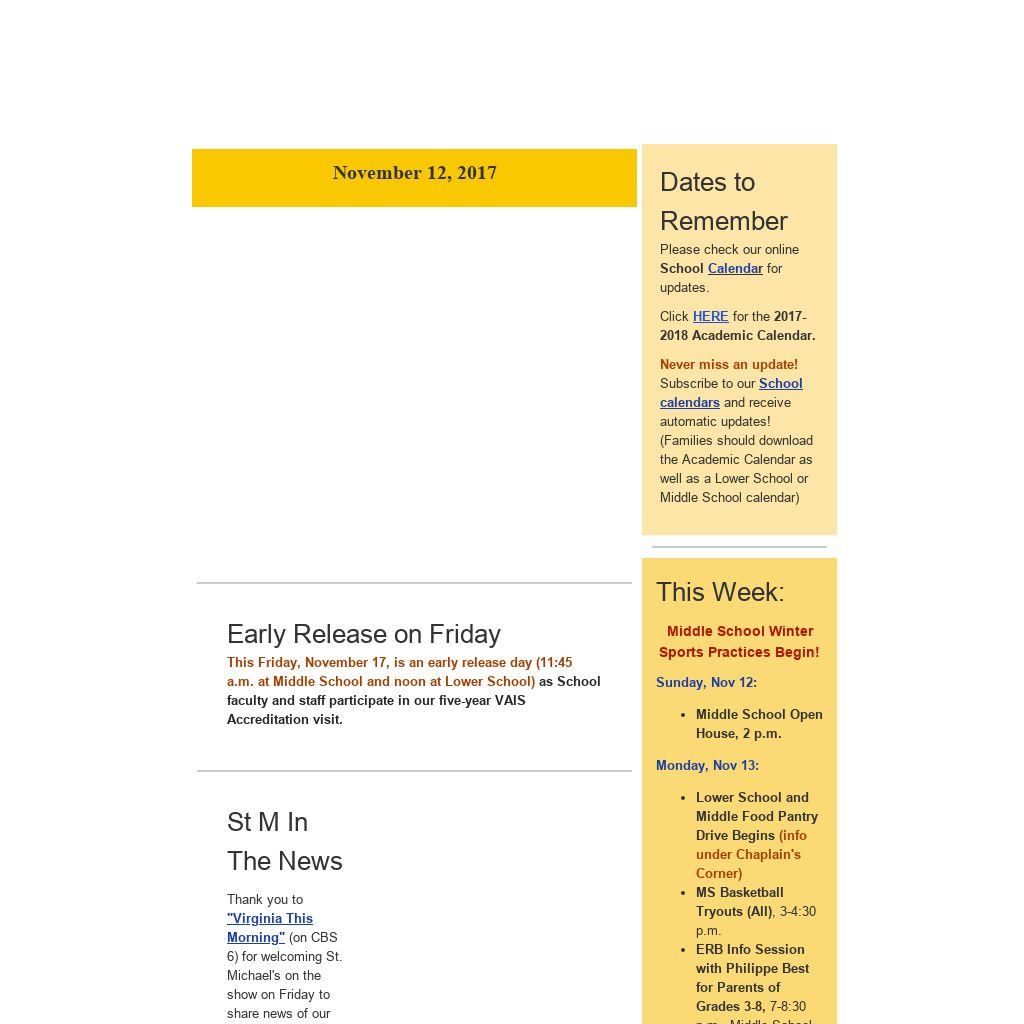 This Friday, November 17, is an early release day (11:45 a.m. at Middle School and noon at Lower School) as School faculty and staff participate in our five-year VAIS Accreditation visit.