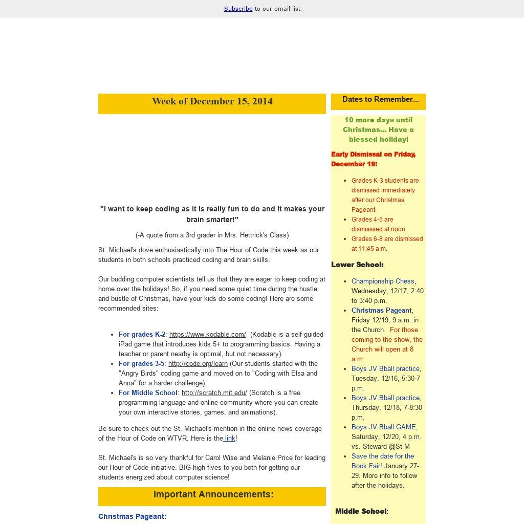 Christmas Pageant: - The Christmas Pageant dress rehearsal will be held at 8:30 a.m. on Thursday, December 18, 2014, at the Bon Air Campus. As always, Middle School students will attend the dress rehearsal. Thus, Middle School students should be dropped off at the St. Michael’s Church by 8:15 a.m. that morning. Drivers who have signed up to transport students back to the Singleton campus should be at the church no later than 9:00 a.m. Students will be assigned to a driver by their homeroom teachers.