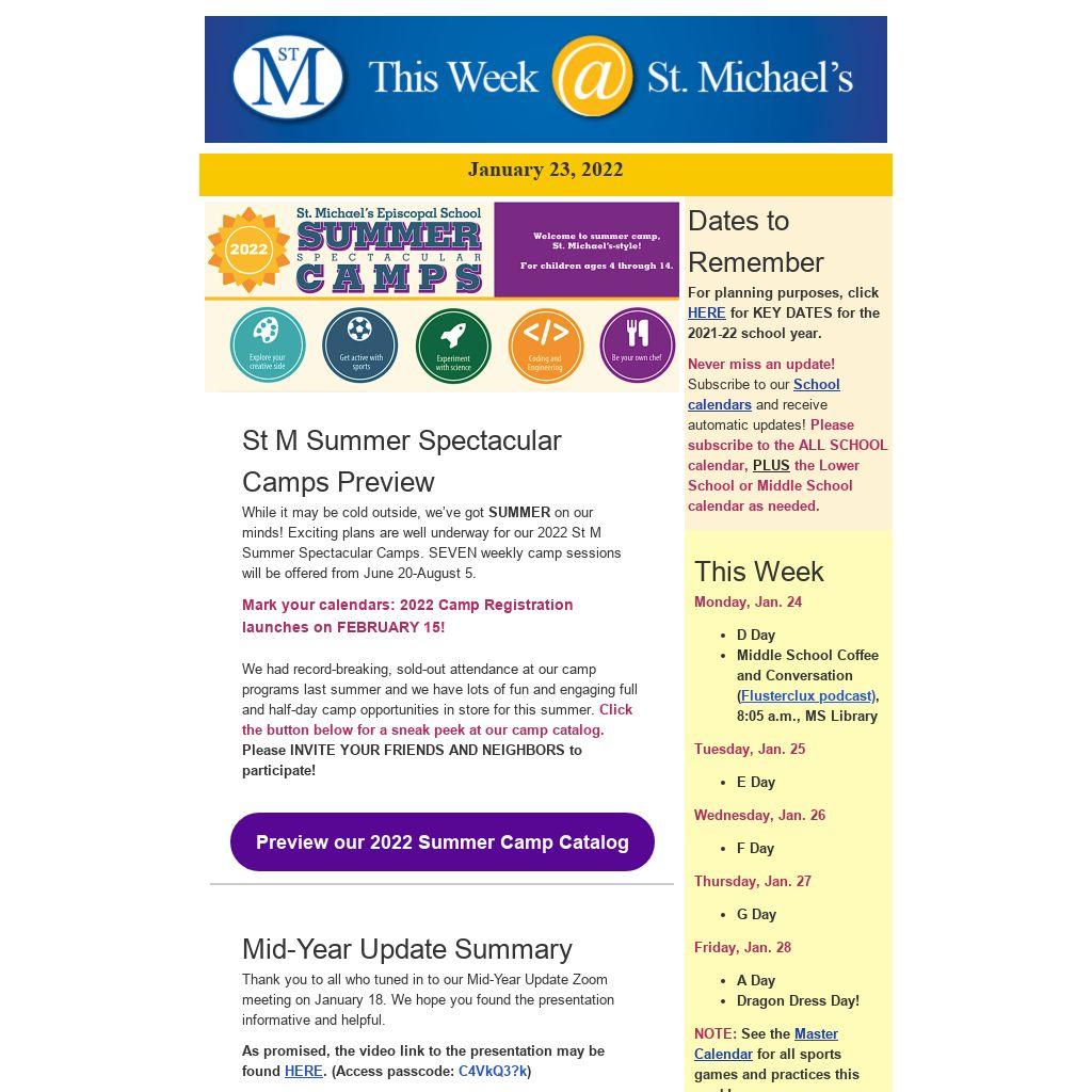 From here, St. Michael’s will stay the course on our required COVID mitigation policies until we see a significant improvement in case trends. We anticipate communicating an update to families about our mask and mitigation policies on or about February 15, unless circumstances warrant any changes to St. Michael’s policies sooner.