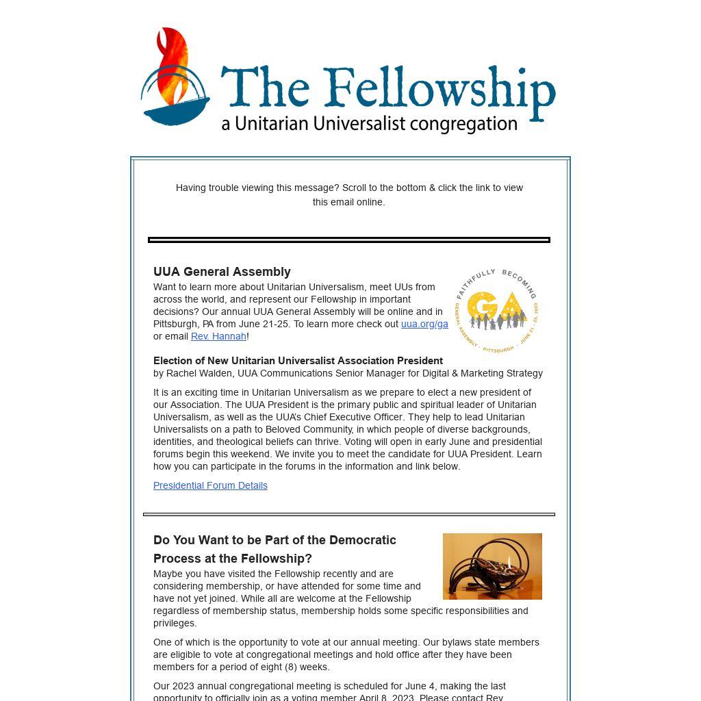 The Fellowship Governing Board and Executive Team are hoping that all members and friends of the Fellowship will participate in our annual congregational survey. The information gathered in this survey is of critical importance as we evaluate progress toward the Fellowship’s goals and identify areas in which we need to dedicate additional time and resources. Your opinion counts.