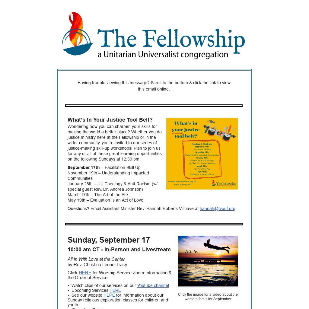 Tell Me More!Sunday, September 17, 12:30 pm Join one of our ministers and a member of our Generosity & Engagement Ministries for an informal 90-minute session to learn more about Unitarian Universalism and this Fellowship. This is a great opportunity for newcomers to learn more, and for longtimers to refresh their connection to this congregation and to the larger UU tradition.