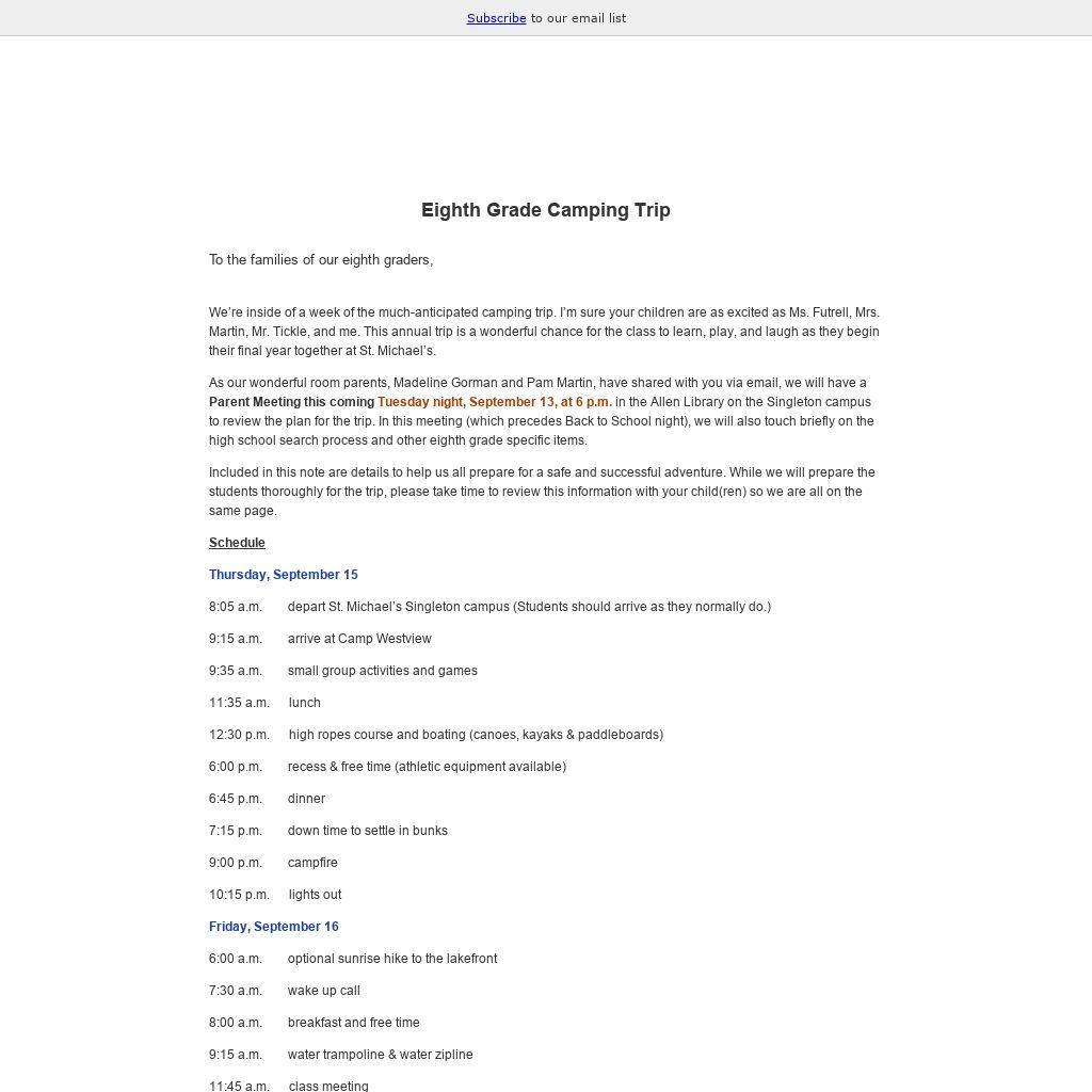 We’re inside of a week of the much-anticipated camping trip. I’m sure your children are as excited as Ms. Futrell, Mrs. Martin, Mr. Tickle, and me. This annual trip is a wonderful chance for the class to learn, play, and laugh as they begin their final year together at St. Michael’s.