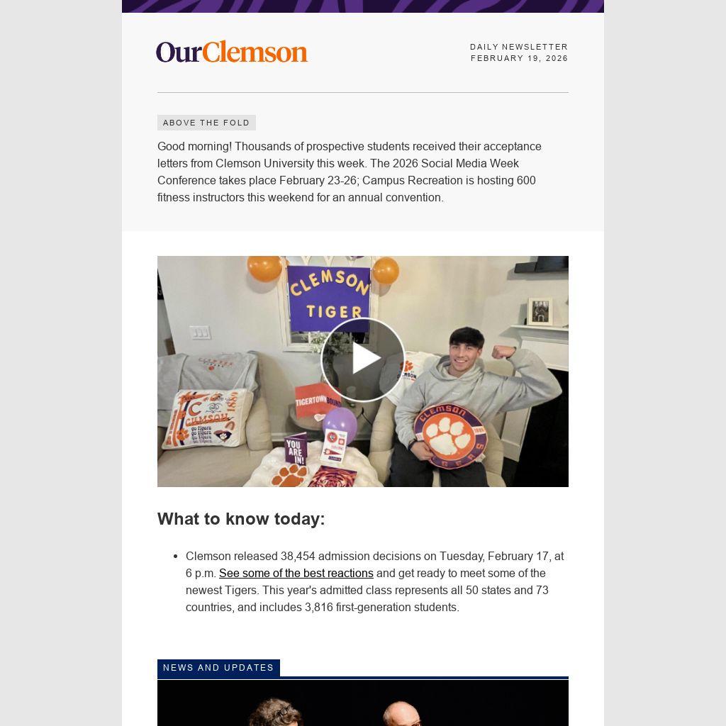 Good morning! Thousands of prospective students received their acceptance letters from Clemson University this week. The 2026 Social Media Week Conference takes place February 23-26; Campus Recreation is hosting 600 fitness instructors this weekend for an annual convention.