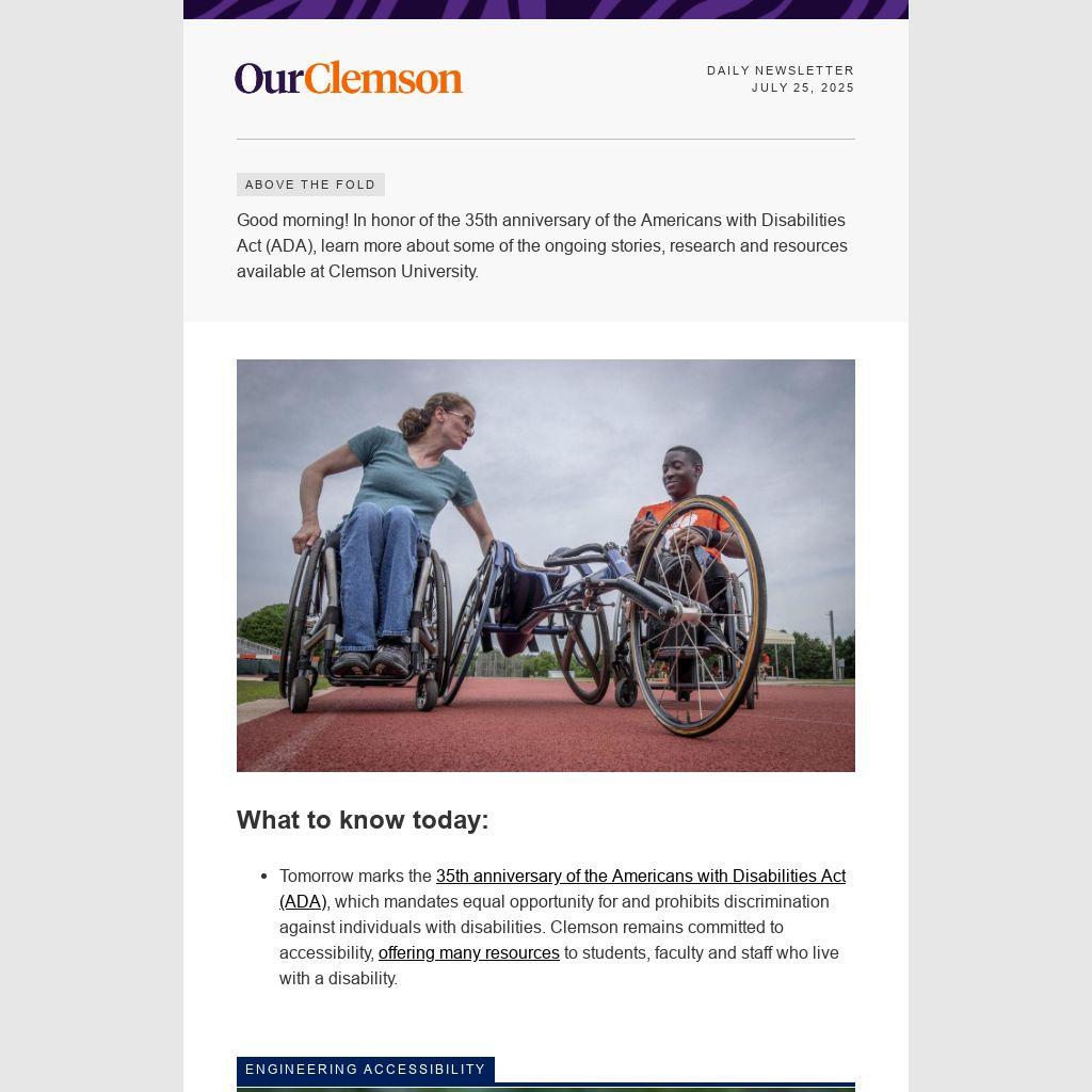Good morning! In honor of the 35th anniversary of the Americans with Disabilities Act (ADA), learn more about some of the ongoing stories, research and resources available at Clemson University.