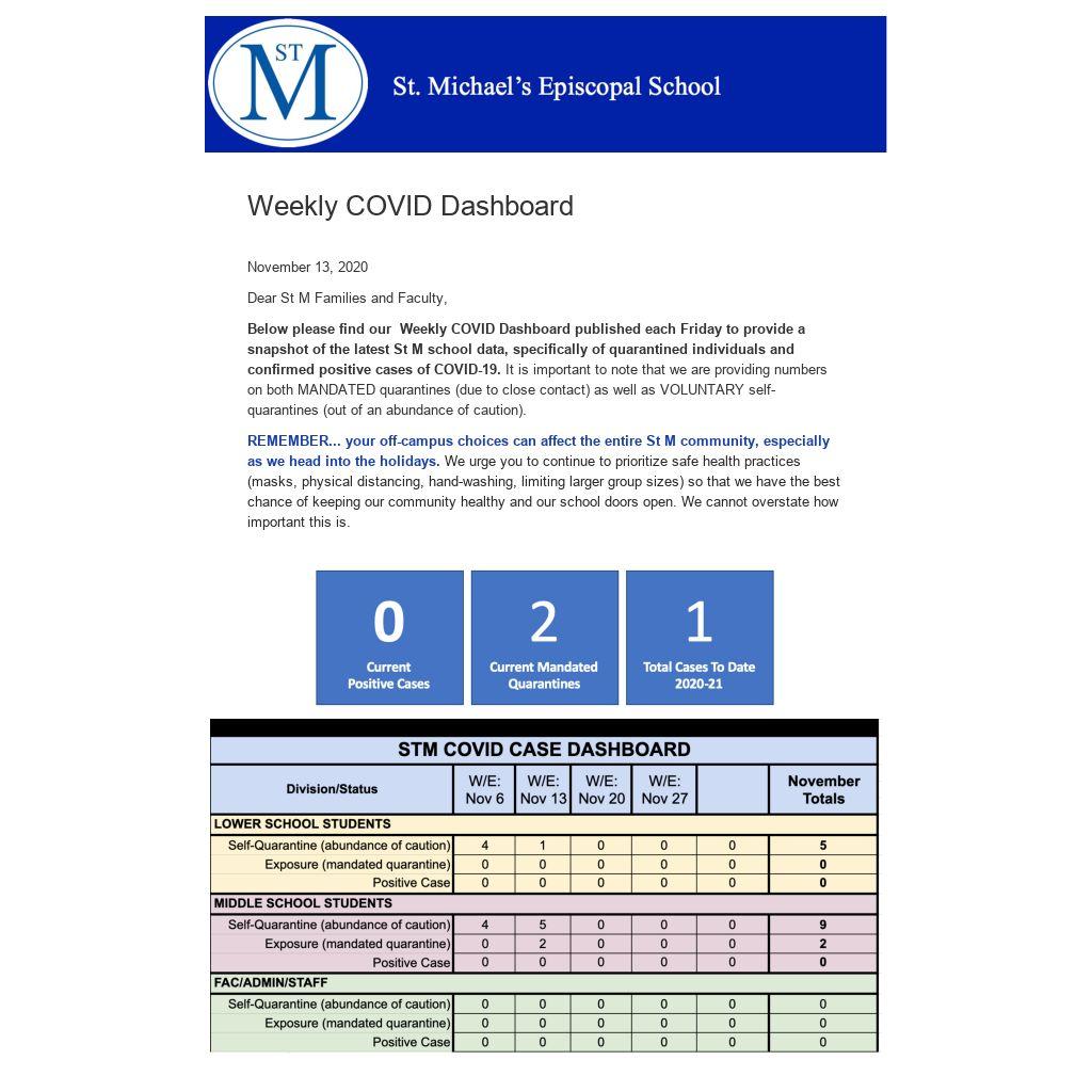 Below please find our Weekly COVID Dashboard published each Friday to provide a snapshot of the latest St M school data, specifically of quarantined individuals and confirmed positive cases of COVID-19. It is important to note that we are providing numbers on both MANDATED quarantines (due to close contact) as well as VOLUNTARY self-quarantines (out of an abundance of caution).