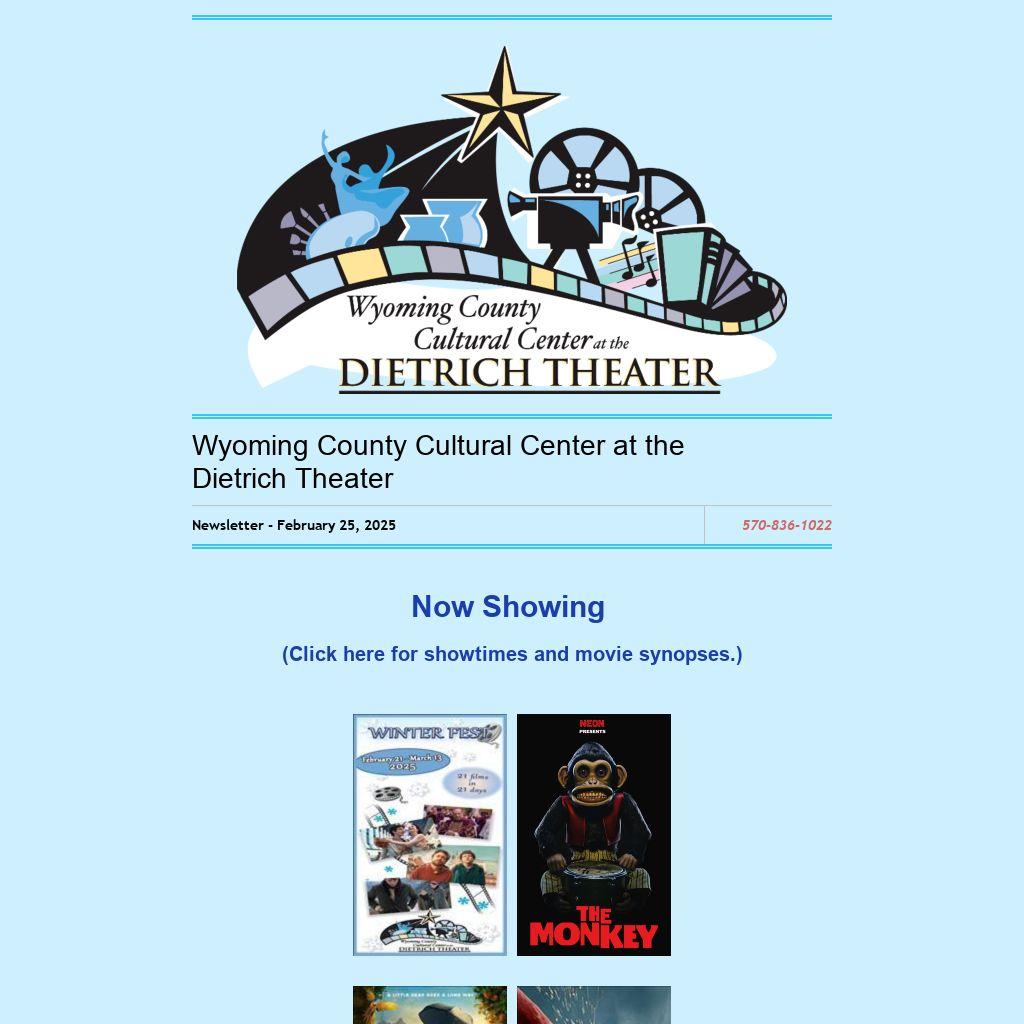 Coming up on Sunday, March 16 at 2:00 p.m. and 7:00 p.m. is another kind of film experience. Buster Keaton’s Sherlock Jr. with R.E.M: A Silents Synced Film. This is so cool! A silent film paired with rock music performed 70 years later! Come see Buster Keaton’s silent slapstick comedy, accompanied by 1990’s music. What a neat idea! Tickets are $8.50 each. To get yours, stop at the ticket booth or call the Dietrich at 570-836 –1022 x3.
