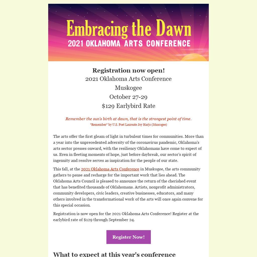 The Oklahoma Arts Council is monitoring the status of the coronavirus pandemic and routinely reviewing public health guidelines. Our priority is to provide a safe opportunity for Oklahoma's arts and cultural sector to convene. "Embracing the Dawn" face masks will be furnished to all conference attendees.
