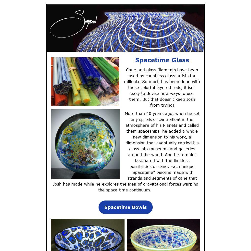 More than 40 years ago, when he set tiny spirals of cane afloat in the atmosphere of his Planets and called them spaceships, he added a whole new dimension to his work, a dimension that eventually carried his glass into museums and galleries around the world. And he remains fascinated with the limitless possibilities of cane. Each unique "Spacetime" piece is made with strands and segments of cane that Josh has made while he explores the idea of gravitational forces warping the space-time continuum.