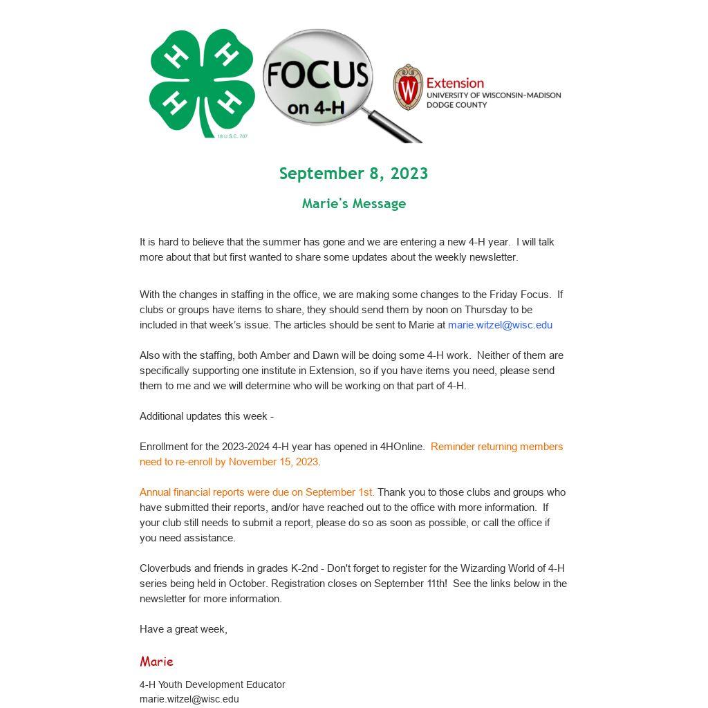It is hard to believe that the summer has gone and we are entering a new 4-H year. I will talk more about that but first wanted to share some updates about the weekly newsletter.