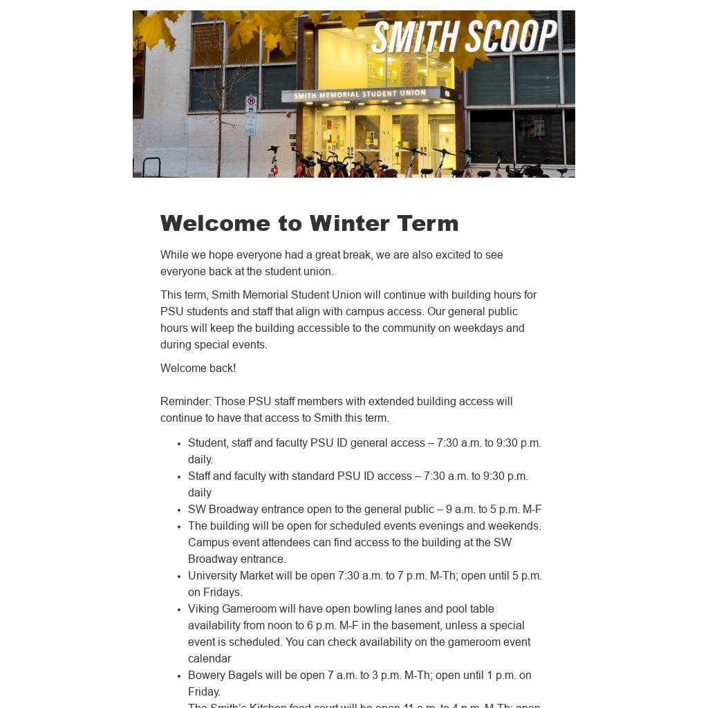 This term, the Smith coffee shop in the Broadway lobby will be operated as Caffeine Cove. This locally owned operation will serve up fresh Nossa Famila Coffee, energy drinks and pastries from Portland's Dos Hermanos. Look for more menu options to come! It will be open from 7:30 a.m. to 4 p.m. Monday-Thursday, 7:30 a.m. to 3 p.m. on Fridays.