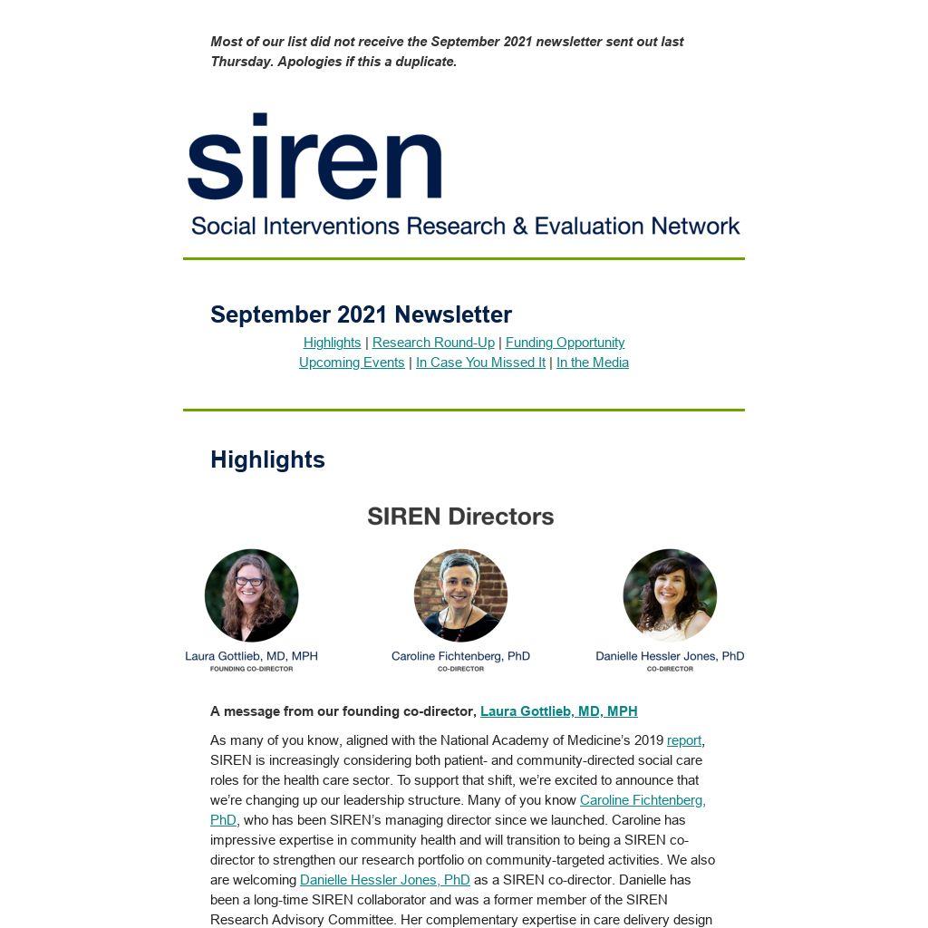 As many of you know, aligned with the National Academy of Medicine’s 2019 report, SIREN is increasingly considering both patient- and community-directed social care roles for the health care sector. To support that shift, we’re excited to announce that we’re changing up our leadership structure. Many of you know Caroline Fichtenberg, PhD, who has been SIREN’s managing director since we launched. Caroline has impressive expertise in community health and will transition to being a SIREN co-director to strengthen our research portfolio on community-targeted activities. We also are welcoming Danielle Hessler Jones, PhD as a SIREN co-director. Danielle has been a long-time SIREN collaborator and was a former member of the SIREN Research Advisory Committee. Her complementary expertise in care delivery design and change management will help SIREN deepen our existing clinical research portfolio. As always, don’t hesitate to reach out to anyone our team with questions about our work.