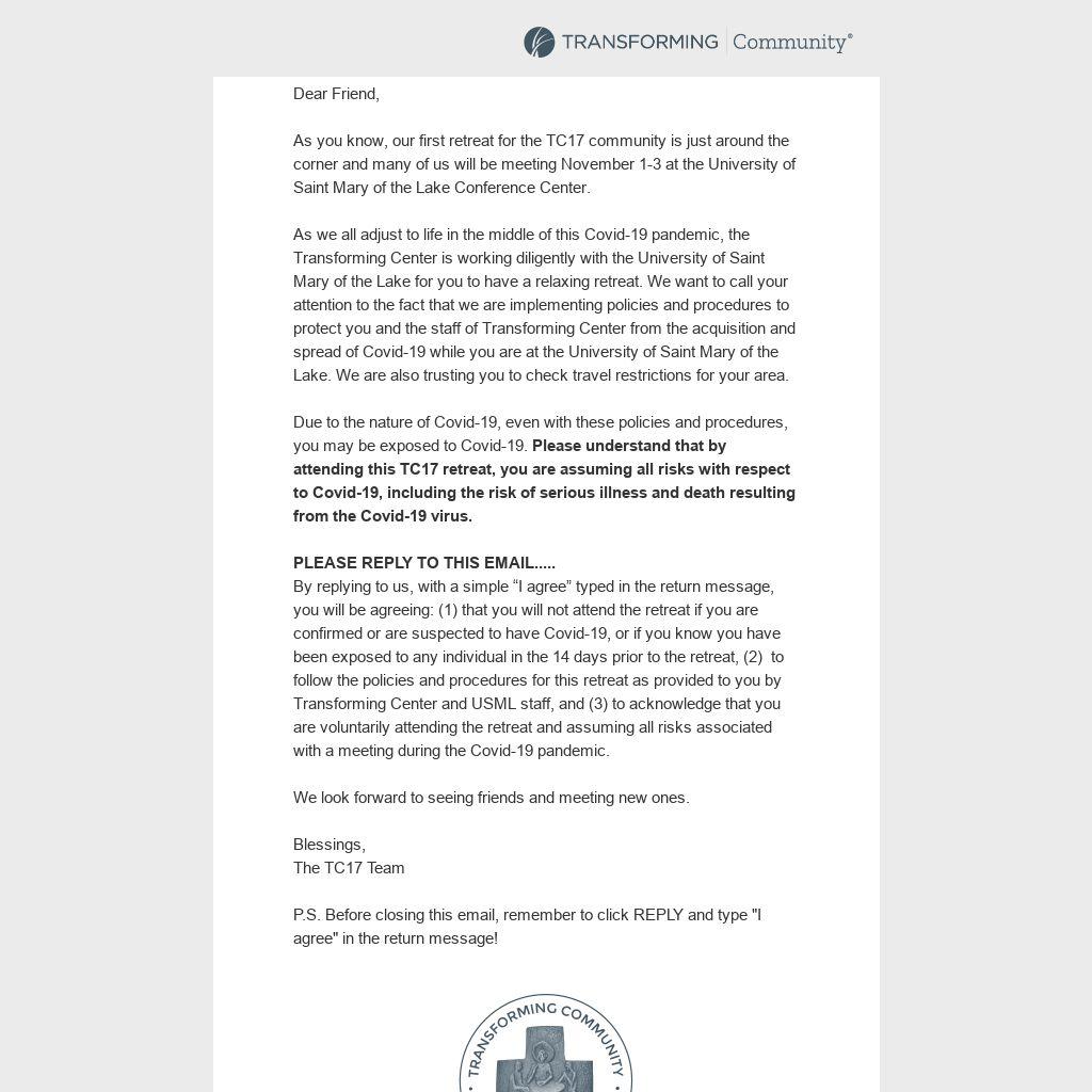 By replying to us, with a simple “I agree” typed in the return message, you will be agreeing: (1) that you will not attend the retreat if you are confirmed or are suspected to have Covid-19, or if you know you have been exposed to any individual in the 14 days prior to the retreat, (2) to follow the policies and procedures for this retreat as provided to you by Transforming Center and USML staff, and (3) to acknowledge that you are voluntarily attending the retreat and assuming all risks associated with a meeting during the Covid-19 pandemic.