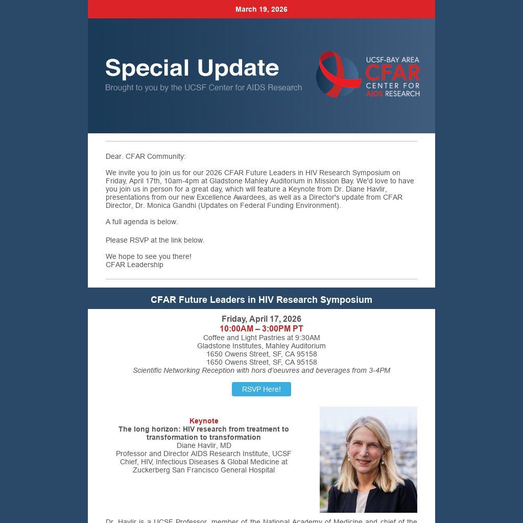 We invite you to join us for our 2026 CFAR Future Leaders in HIV Research Symposium on Friday, April 17th, 10am-4pm at Gladstone Mahley Auditorium in Mission Bay. We'd love to have you join us in person for a great day, which will feature a Keynote from Dr. Diane Havlir, presentations from our new Excellence Awardees, as well as a Director's update from CFAR Director, Dr. Monica Gandhi (Updates on Federal Funding Environment).