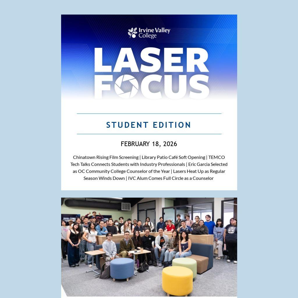 Chinatown Rising Film Screening | Library Patio Café Soft Opening | TEMCO Tech Talks Connects Students with Industry Professionals | Eric Garcia Selected as OC Community College Counselor of the Year | Lasers Heat Up as Regular Season Winds Down | IVC Alum Comes Full Circle as a Counselor