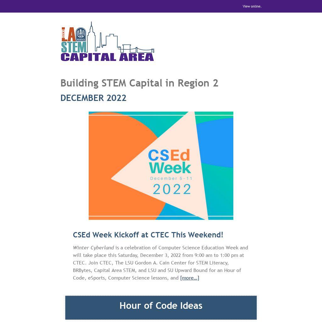 Winter Cyberland is a celebration of Computer Science Education Week and will take place this Saturday, December 3, 2022 from 9:00 am to 1:00 pm at CTEC. Join CTEC, The LSU Gordon A. Cain Center for STEM Literacy, BRBytes, Capital Area STEM, and LSU and SU Upward Bound for an Hour of Code, eSports, Computer Science lessons, and [more…]