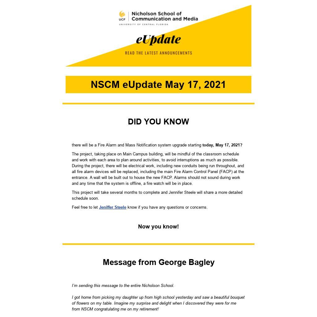 I’m so touched by that gesture. I’ve been receiving some wonderful messages from former students and colleagues, and these flowers just send my gratitude over the top. I’m lucky to have served UCF for 25 years, to have taught and mentored some brilliant individuals, and to have associated myself with NSCM and R-TV. I was given a chance in 1996 having just come from a career in news and documentary. I’m as grateful now as I was then that those who made that decision did so in my favor and opened the door to such a wonderful second career. Please communicate to those around you how much I’ll miss working with them and my best wishes as they proceed forward with their teaching and scholarship at NSCM.