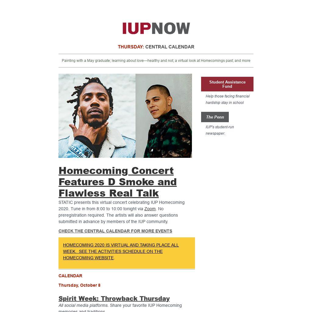 10:00 a.m., IUP Facebook. Watch a video montage of Homecoming parades from the last 50 years, set to IUP Marching Band music.