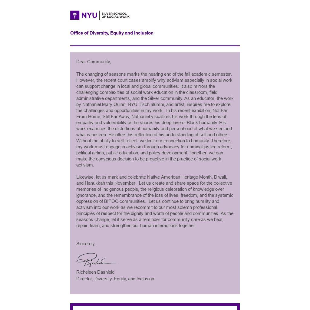 On October 21, during NYU Alumni and Parents Weekend, the Director of the Office of Diversity, Equity, and Inclusion, Richeleen Dashield gave a presentation on Silver’s DEI Framework. The presentation served as a transparent update for remote members of the community showing the initiatives, workgroups and committees, and activities meant to further infuse the principles of DEI within the school. Have a look at what our committees have been discussing by reading the most recent minutes from our community planning meetings and Social Justice Praxis Committee.