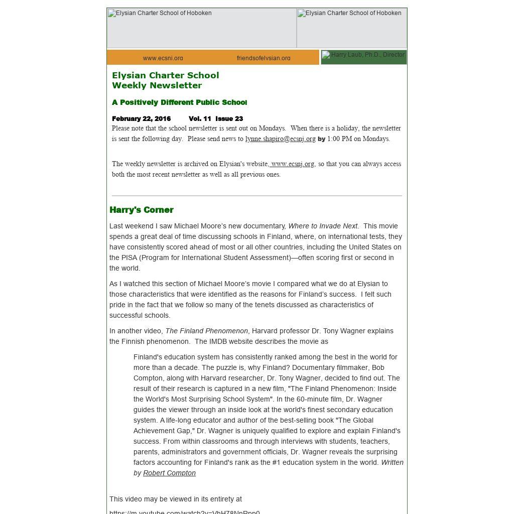 | Harry's Corner Last weekend I saw Michael Moore’s new documentary, Where to Invade Next. This movie spends a great deal of time discussing schools in Finland, where, on international tests, they have consistently scored ahead of most or all other countries, including the United States on the PISA (Program for International Student Assessment)—often scoring first or second in the world. As I watched this section of Michael Moore’s movie I compared what we do at Elysian to those characteristics that were identified as the reasons for Finland’s success. I felt such pride in the fact that we follow so many of the tenets discussed as characteristics of successful schools. In another video, The Finland Phenomenon, Harvard professor Dr. Tony Wagner explains the Finnish phenomenon. The IMDB website describes the movie as Finland's education system has consistently ranked among the best in the world for more than a decade. The puzzle is, why Finland? Documentary filmmaker, Bob Compton, along with Harvard researcher, Dr. Tony Wagner, decided to find out. The result of their research is captured in a new film, "The Finland Phenomenon: Inside the World's Most Surprising School System". In the 60-minute film, Dr. Wagner guides the viewer through an inside look at the world's finest secondary education system. A life-long educator and author of the best-selling book "The Global Achievement Gap," Dr. Wagner is uniquely qualified to explore and explain Finland's success. From within classrooms and through interviews with students, teachers, parents, administrators and government officials, Dr. Wagner reveals the surprising factors accounting for Finland's rank as the #1 education system in the world. Written by Robert Compton