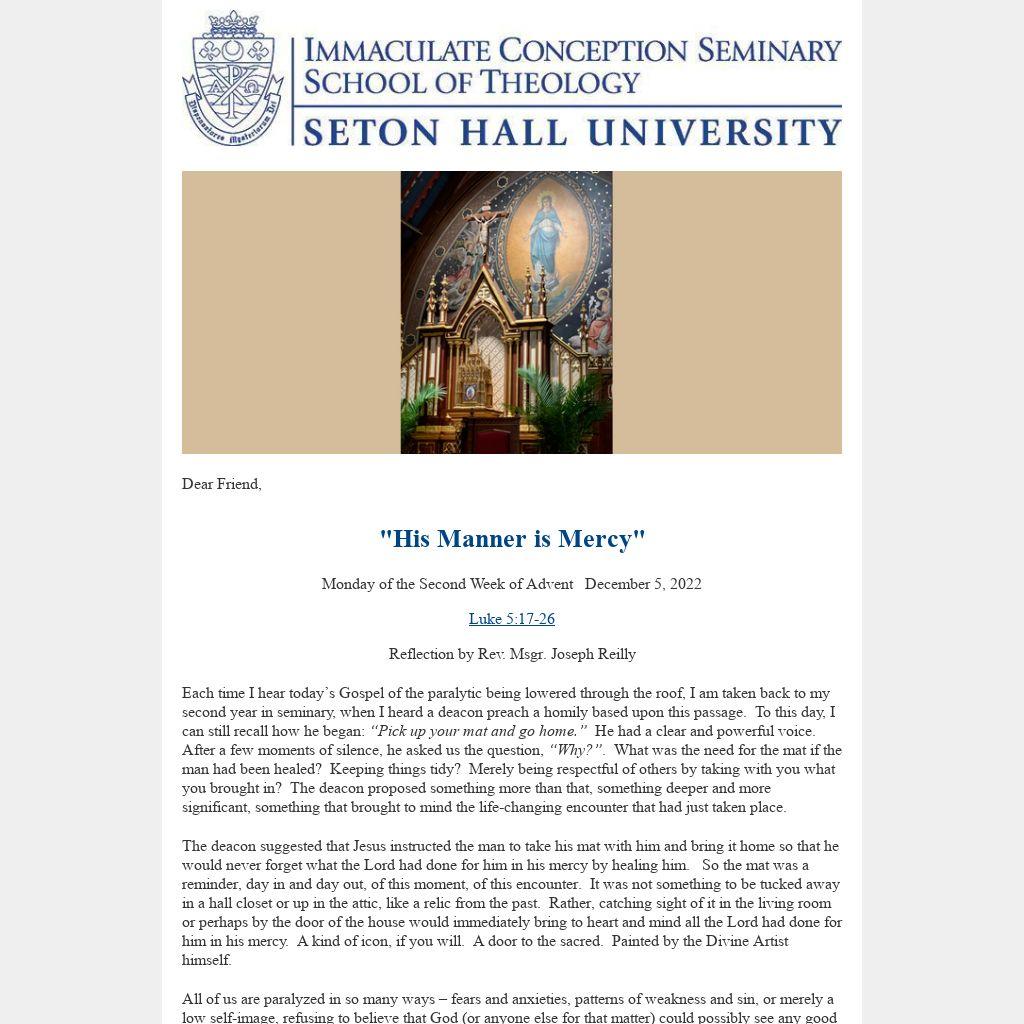 Rev. Msgr. Joseph Reilly, S.T.L., Ph.D., former Rector/Dean, Immaculate Conception Seminary School of Theology. He holds a Bachelor of Sacred Theology from Pontifical Gregorian University, Rome, a licentiate in Sacred Theology (STL) from Pontificio Istituto Teresianum, Rome, and a Ph.D. in Educational Administration from Fordham University. He has served as a member of the Archdiocesan Priest Personnel Board, the Advisory Committee on Continuing Education and Ongoing Formation of Priests, the Archdiocesan Vocations Board, and the Board of Trustees of Seton Hall University. Pope John Paul II named him a Chaplain to His Holiness in 2005, with the title of Reverend Monsignor. In 2016 during the Holy Year of Mercy, the Pontifical Council for Promoting New Evangelization sought priests who were living signs "of the Father's welcome to all those in search of His forgiveness." He was the only priest from the Archdiocese of Newark formally commissioned as a Missionary of Mercy by Pope Francis.