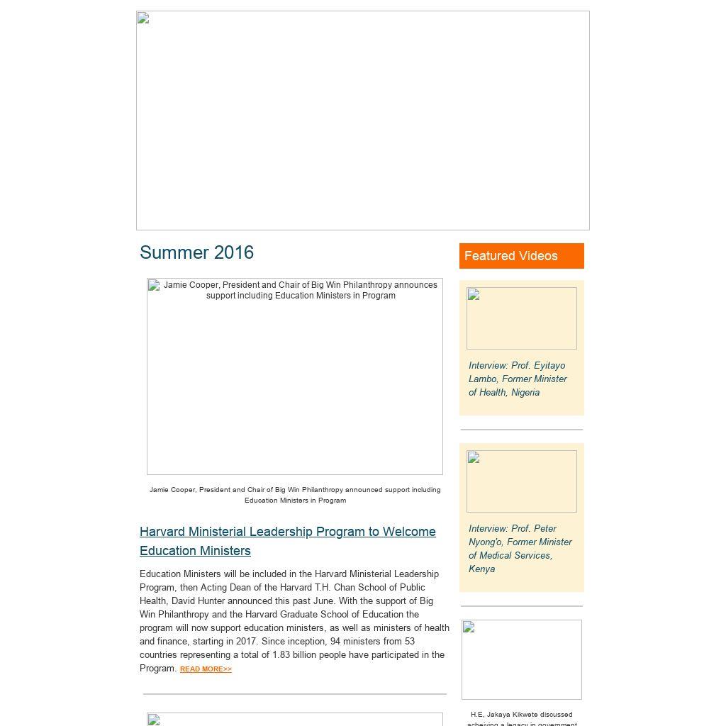 Education Ministers will be included in the Harvard Ministerial Leadership Program, then Acting Dean of the Harvard T.H. Chan School of Public Health, David Hunter announced this past June. With the support of Big Win Philanthropy and the Harvard Graduate School of Education the program will now support education ministers, as well as ministers of health and finance, starting in 2017. Since inception, 94 ministers from 53 countries representing a total of 1.83 billion people have participated in the Program. READ MORE>>