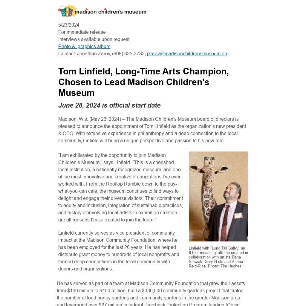 Madison, Wis. (May 23, 2024) – The Madison Children's Museum board of directors is pleased to announce the appointment of Tom Linfield as the organization's new president & CEO. With extensive experience in philanthropy and a deep connection to the local community, Linfield will bring a unique perspective and passion to his new role.