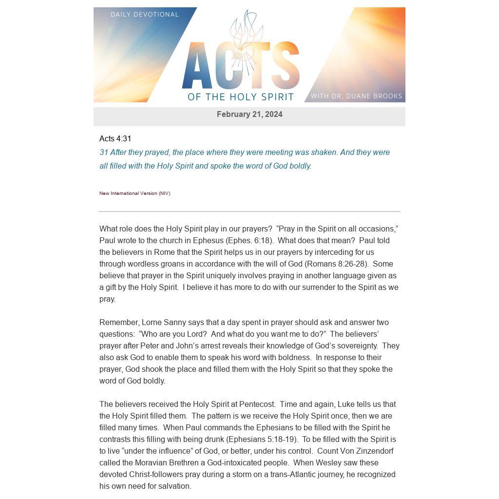 As we pray today, God can fill us with his Spirit. This may be manifested in many ways. We may be filled with joy and peace. In our text, we see that the Spirit grants boldness to speak God’s word. British Pastor David Martyn Lloyd-Jones once said to his congregation, “I know that we received all of the Holy Spirit you will ever receive at salvation. If that is true, what in the world have we done with him?” We can grieve the Holy Spirit and quench the Holy Spirit, but not lose the Holy Spirit. Whatever we have done with the Spirit, he is not done with us. No one has a monopoly on the Holy Spirit but the Holy Spirit can have a monopoly on us. May it be so today, as we pray.