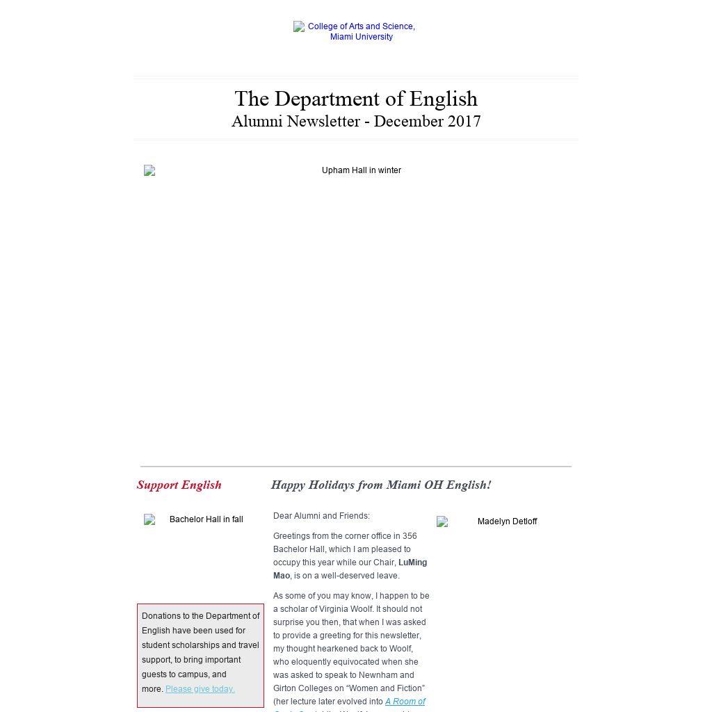 | Dear Alumni and Friends: Greetings from the corner office in 356 Bachelor Hall, which I am pleased to occupy this year while our Chair, LuMing Mao, is on a well-deserved leave. As some of you may know, I happen to be a scholar of Virginia Woolf. It should not surprise you then, that when I was asked to provide a greeting for this newsletter, my thought hearkened back to Woolf, who eloquently equivocated when she was asked to speak to Newnham and Girton Colleges on “Women and Fiction” (her lecture later evolved into A Room of One’s Own). Like Woolf, I am caught between the Scylla and Charybdis of genre expectations and limited space for expression. If I am to fulfill my duty as Acting Chair and newsletter greeter, I must begin with warm wishes for a happy holiday season and joyous New Year. This I can do unreservedly – I wish you peace and joy, not to mention love and honor, this season and for all of 2018. I have had the distinct pleasure of meeting many of you over my 15 years here at Miami University, and you never cease to amaze me with your talent, good will, and good ideas. The University community was treated to a small sampling of your virtuosity this fall when three English Department alumni were honored with prestigious “18 of the Last 9” alumni awards. To fulfill my second duty – to give you a sense of all of the good work the English Department has done since Dr. Mao last greeted you in June – I would need the rhetorical gifts of Woolf and the bandwidth of a state-of- the-art server worthy of our new colleagues, Dr. Adam Strantz (who specializes in visual rhetorics and professional writing), and Dr. Collin Jennings (who specializes in digital humanities, the long 18th Century, and computational linguistics). My last sentence should alert you to how deep into the 21st century we are evolving as a department, while continuing to carefully attend to the language, culture, and creative worldmaking that have shaped us over the centuries. In addition to doing what we do best – teaching, researching, and writing with passion and commitment – the English Department has embarked on a year-long process of self-reflection led by professors Cathy Wagner, Elizabeth Wardle, Katie Johnson, and Gwen Etter-Lewis. Our goal is to is to discuss and articulate our values so that our teaching and scholarly practices are aligned with our vision and goals for the future of English studies at Miami University. For this, we ask for your help – your input, your experience, your insights – as we move forward. I am not asking you for money here (although my friends in University Advancement would not turn away a year-end donation). I am asking for your ambassadorship. We know, and you know because you are our proud graduates, that students majoring in Literature, Creative Writing, Professional Writing, and Linguistics go on to successful careers and enriching lives. There are plenty of data to prove that, but the power of example is even more persuasive. On that note, please do spread the word about English at Miami University and English studies in general. And please keep in touch with your ideas. We are proud of the leaders, thinkers, artists, path-breakers, and humanitarians who have graced our hallways and classrooms since 1809. Pride is a virtue according to Aristotle. So in 2018, I’m asking you to flaunt your English major pride just a little more so that the next generations know what English has to offer. Love and Honor, Peace and Joy, Madelyn Detloff
