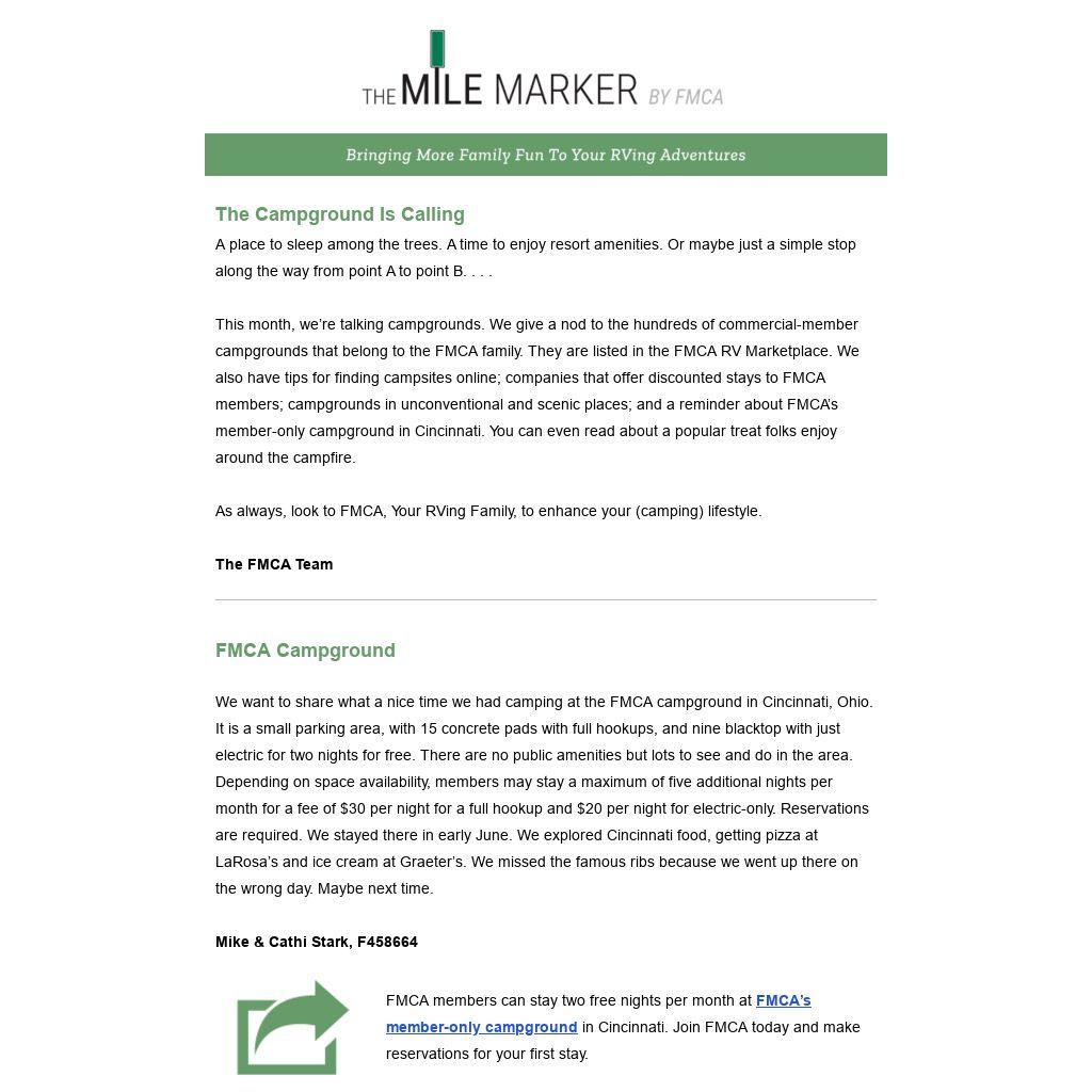 | FMCA members can stay two free nights per month at FMCA’s member-only campground in Cincinnati. Join FMCA today and make reservations for your first stay.
